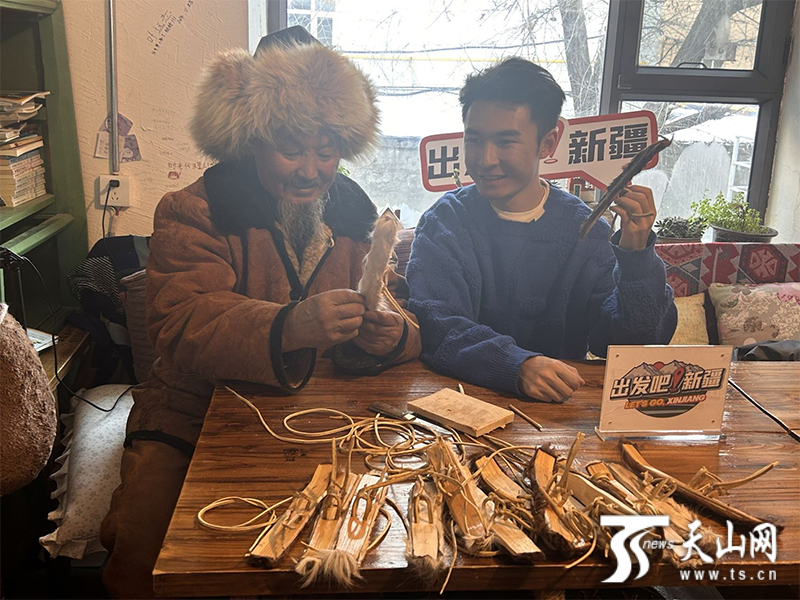 斯兰别克·沙和什(左)教@会飞的皮皮猪(右)制作古老毛皮滑雪板。